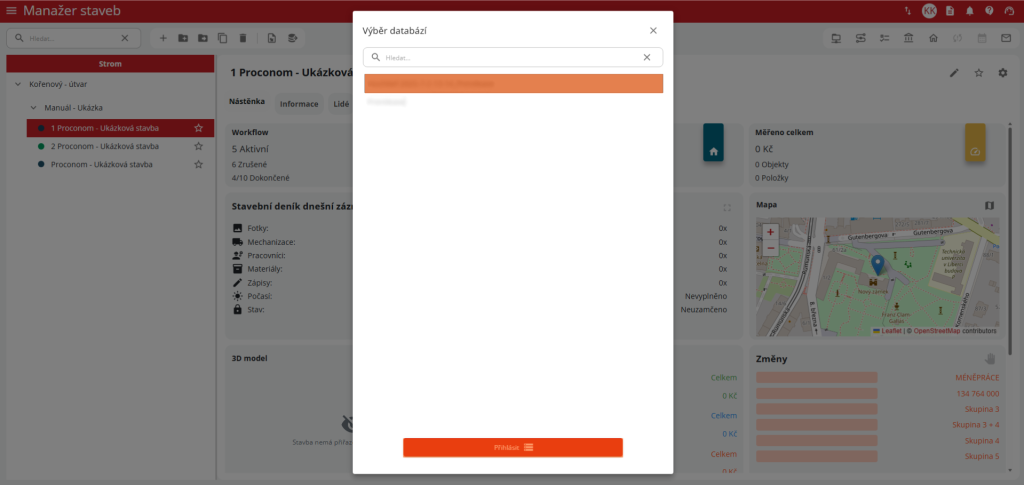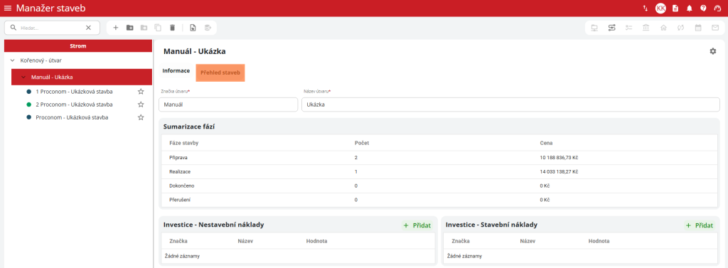 Uživatel může zobrazit přehled staveb v případě, že má označený útvar. Kliknutím levého tlačítka myši na kartu „Přehled staveb“ v horní liště.
