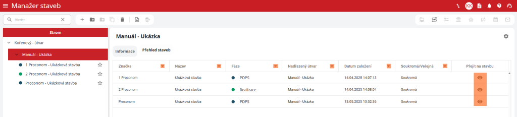 Pro přechod na stavbu klikne uživatel na ikonu oka