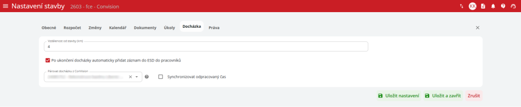 Na kartě Docházka uživatel může zapsat vzdálenost v kilometrech. Tato vzdálenost určuje, jak daleko od stavby může zaměstnanec zapínat/vypínat svoji docházku. Aby tato funkce fungovala, je nutné, aby stavba měla nastavené umístění na mapě a aby uživatel měl v mobilní aplikace povolené polohové služby.