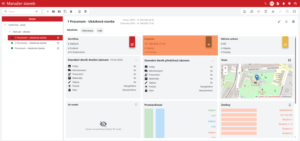 Ve stromovém zobrazení uživatel zvolí jedním kliknutím stavbu. Nyní se ve střední části obrazovky objeví Nástěnka (Dashboard) stavby. V ní se nachází grafické zobrazení různých modulů stavby. Rozpočet sekce se nachází v horní části nástěnky uprostřed. Kliknutím na modrý praporek na panelu, nebo dvojklikem na panel samotný, se otevře modul pro tuto zvolenou stavbu.