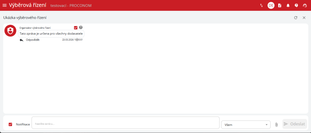 ve widgetu a slouží pro komunikaci mezi zadavatelem a účastníky. Pomocí checkboxu „notifikace“ vlevo dole je možné vypnout/zapnout emailové upozornění. Při odesílání zprávy je možné nastavit, komu se zpráva zobrazí. Ke zprávě je možné přiložit i dokument.