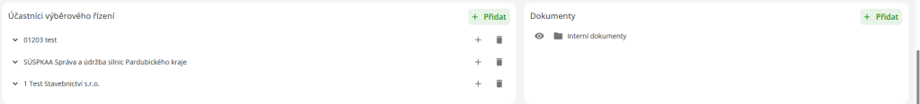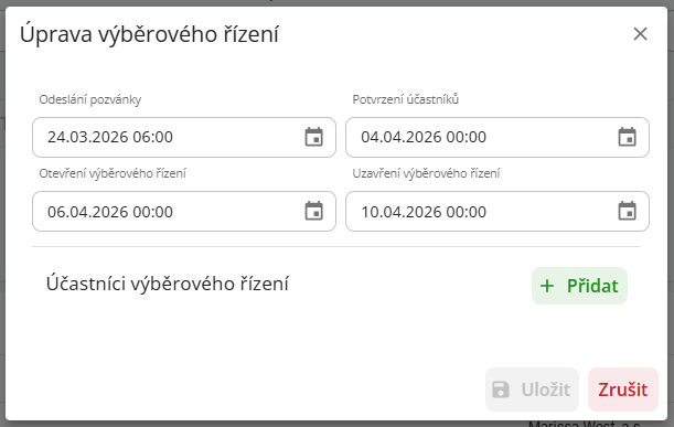Druhá část slouží pro přidání účastníků výběrového řízení. Pomocí tlačítka “Přidat” se objeví pole s lupou a možností otevřít číselník partnerů, kde lze zvolit účastníka výběrového řízení. Partner musí obsahovat alespoň jeden, nebo více kontaktů, pomocí kterého bude účastník informován.