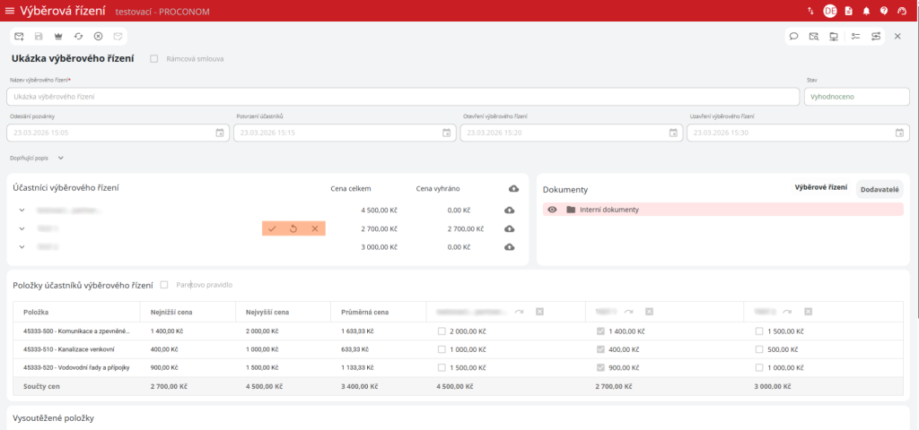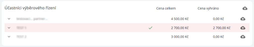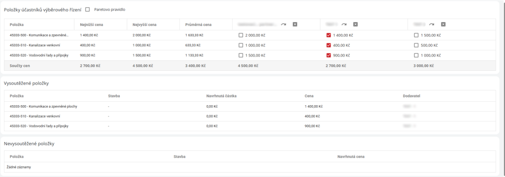 Ve výběrovém řízení je tabulka “Položky účastníků výběrového řízení”, kde je seznam všech položek z výběrového řízení s poslanými cenami od dodavatelů. Zadavatel v této tabulce určí vítěze jednotlivých položek pomocí checkboxů, které se u nich nachází.
