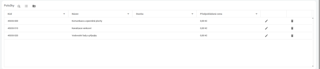 Třetí část výběrového řízení je tabulka položek, kterých se dané výběrové řízení týká. Jsou tři možnosti, jak přiřadit položky k výběrovému řízení, a to buď převzetím položek z projektu, založení vlastních položek nebo převzetím z cenové databáze.