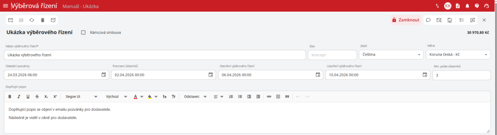Po vyplnění potřebných údajů je nutné pro úspěšné založení a zahájení výběrové řízení uložit a uzamknout. Zámeček se nachází v pravém horním rohu okna. Pokud uživatel pouze řízení uloží, tak se z něho stane koncept.