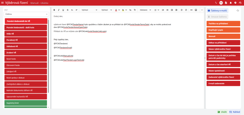 Po kliknutí na ikonu se otevře nové okno, kde se v levé horní části nastavuje jazyk šablon. Dále pak v levé části lze vidět seznam situací, které během průběhu výběrového řízení mohou nastat.
