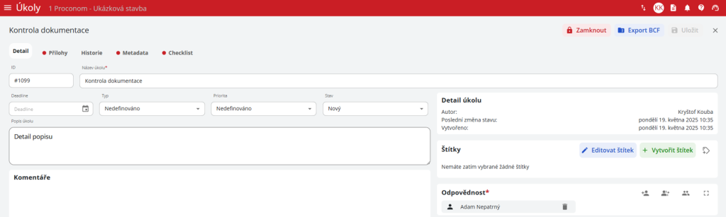 Na této kartě je zobrazen popis úkolu a další detailní informace jako komentáře, typ, prioritu, stav, štítky atd. Pokud je úkol navázán na dokument nebo 3D model, tak je v pravé dolní části obrazovky