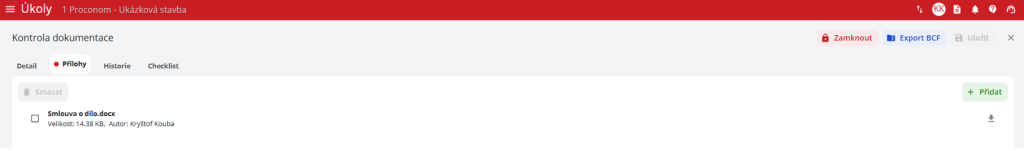 V kartě „Přílohy“ uživatel může nahrát tlačítkem „Přidat“ soubory ze zařízení přímo k úkolu.