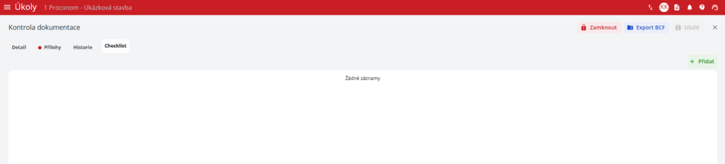 Tato karta slouží pro vytvoření odškrtávacího seznamu. Může sloužit pro přípravu zpracování úkolu. Uživatel přidá položku seznamu tlačítkem „Přidat“ v pravé horní části karty.