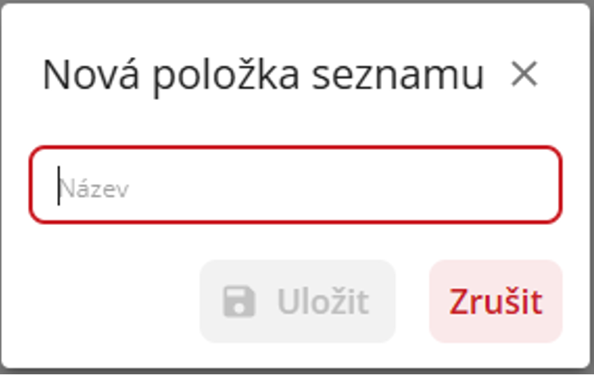 Po stisknutí tlačítka se zobrazí dialogové okno. Zde je potřeba zanést do pole název položky seznamu a volbu potvrdit tlačítkem „Ok“. V případě potřeby zrušení procesu s uživatel může kliknout na tlačítko „Zrušit“.