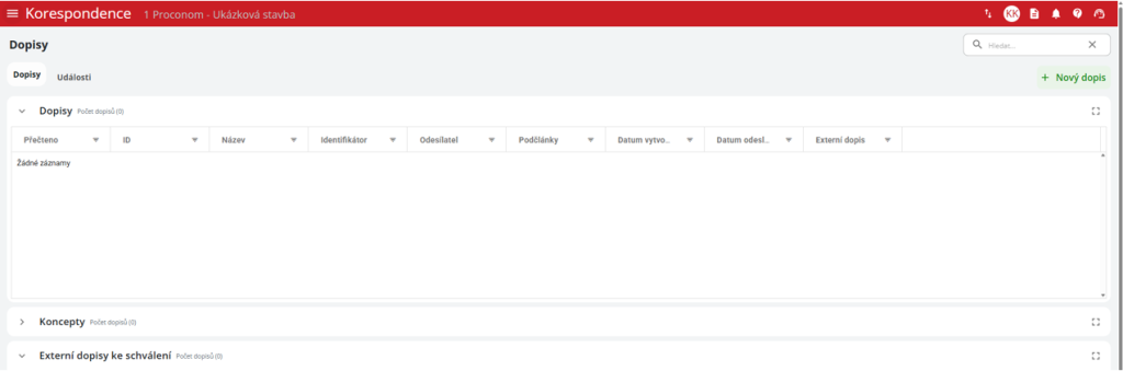 - Dopisy – obsahuje přijaté a odeslané dopisy, tedy komunikaci, která již proběhla.