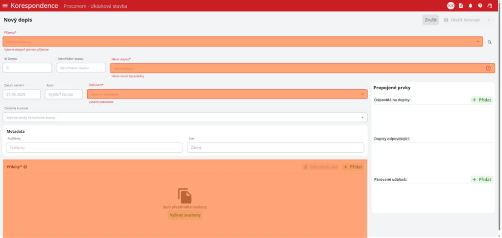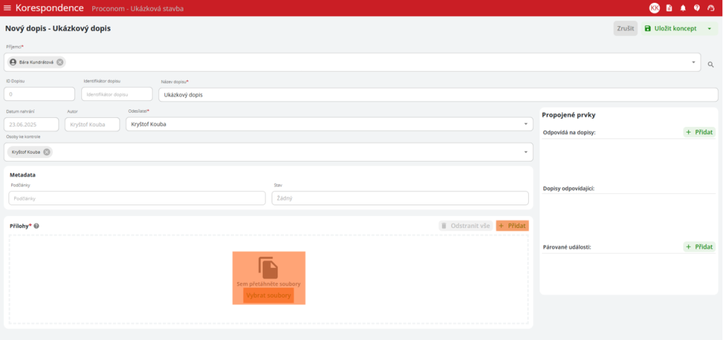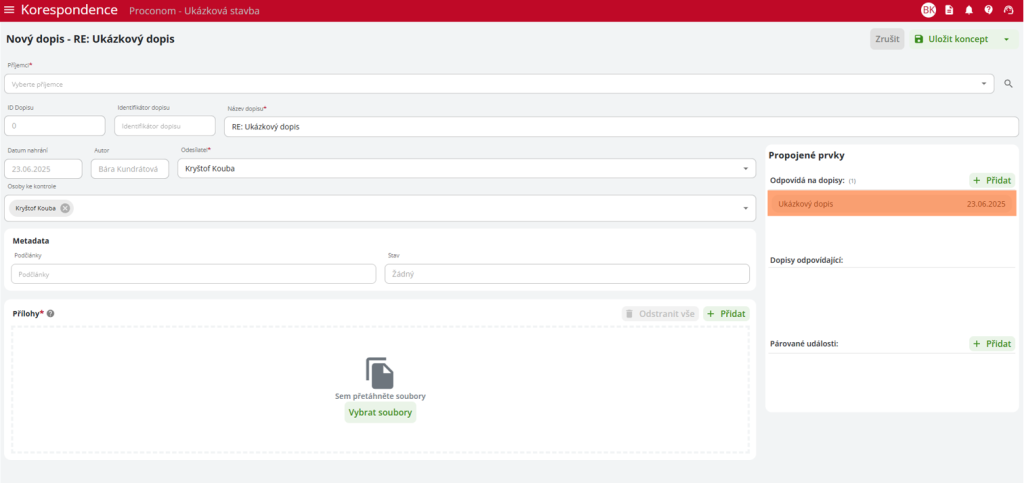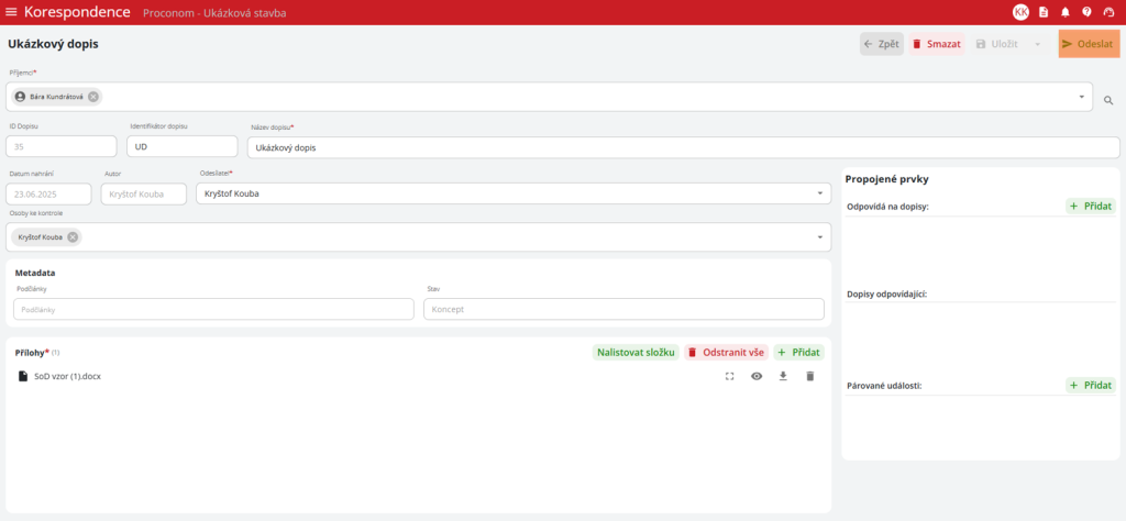 v pravém horním rohu. Uživatel následně vyplní povinné údaje dopisu: příjemce, název dopisu, odesílatele, přílohy a určuje případné napojení na další prvky stavby.