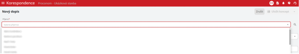 Při vytváření nového dopisu uživatel zvolí externího příjemce. Tento příjemce je označen názvem firmy v závorce (např. Jan Novák (PROCONOM)). Společnost musí být předem evidována v kontaktech partnerů na stavbě.