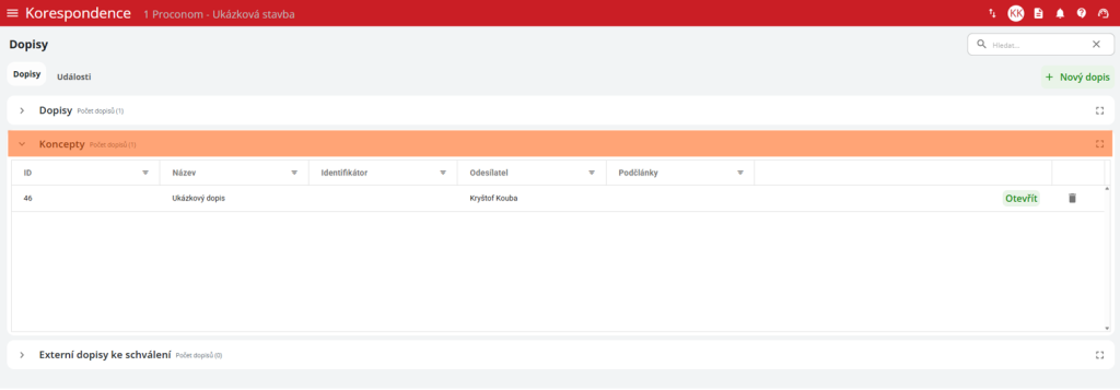 - Externí dopisy ke schválení – Obsahuje dopisy od externích uživatelů čekající na schválení.