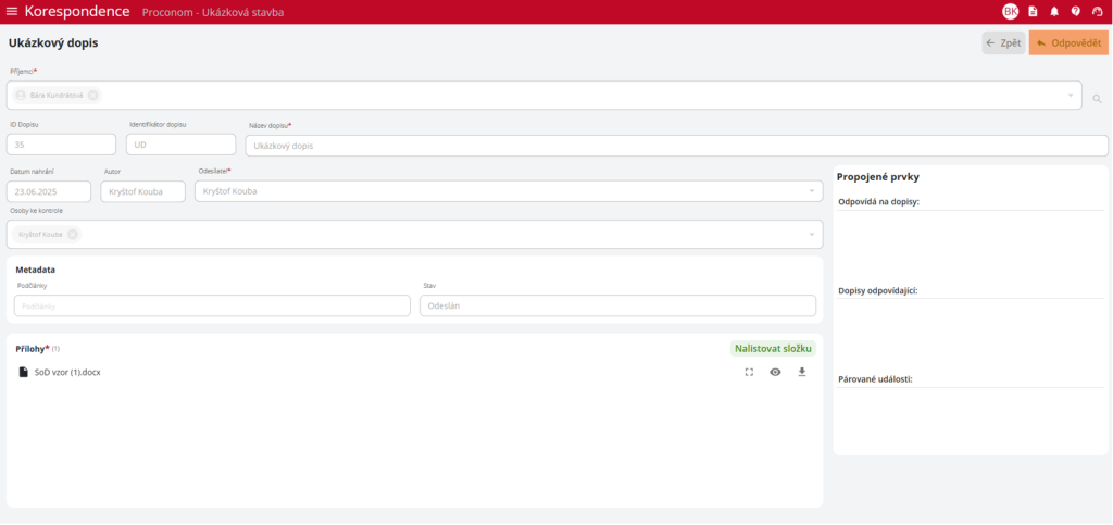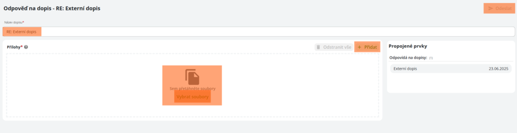 V sekci „Propojené prvky“ se uživateli automaticky přiřadí dopis, na který odpovídá, aby se nenarušila návaznost dopisů.