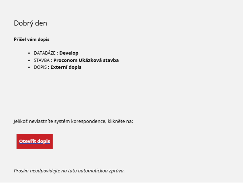 Kliknutím na tlačítko „Přejít na dopis“ se uživatel přesune do webové aplikace PROCONOM, která automaticky zobrazí příchozí dopis.