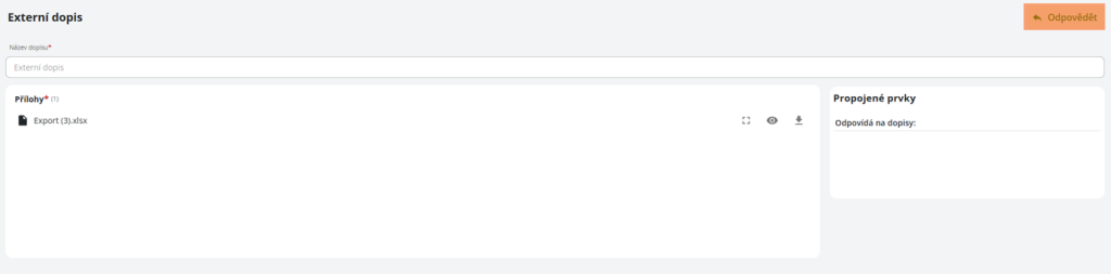 V příchozím dopisu má příjemce kromě informace o vyplněných údajích k dispozici možnost zobrazit přílohy a propojené prvky. Na dopis příjemce odpovídá kliknutím na tlačítko „Odpovědět“
