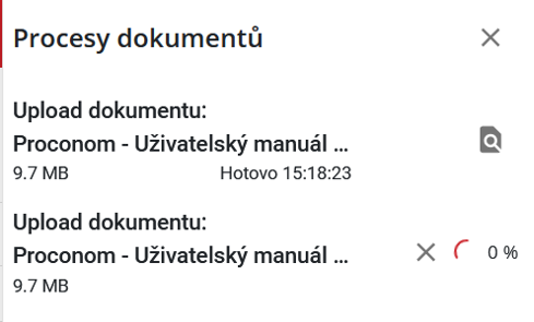 Při nahrávání se v pravé části obrazovky zobrazí widget „Procesy dokumentů“ zobrazující nyní nahrávané soubor, nebo minulé nahrávací akce.