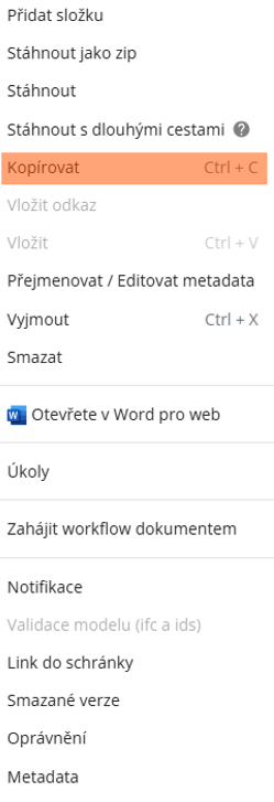 Použít kontextové menu, které se zobrazí po pravém kliknutí myší na dokument/složku v tabulce nebo ve stromovém zobrazení.