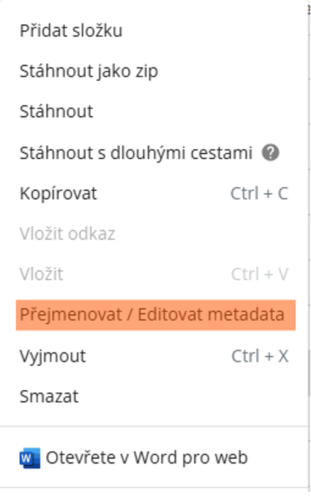 Pro přejmenování souboru či složky v softwaru existují dvě metody. První možnost je otevření kontextového menu kliknutím pravým tlačítkem myši na prvek pro přejmenování a vybrání možnosti “Přejmenovat“.