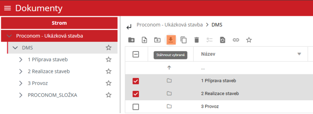 Druhou možností je označení více složek a souborů hromadně za držení klávesy Shift nebo Ctrl, nebo jednotlivě kliknutím na checkbox v hlavní tabulce a stisknutí tlačítka „Stáhnout vybrané“ v horní liště.