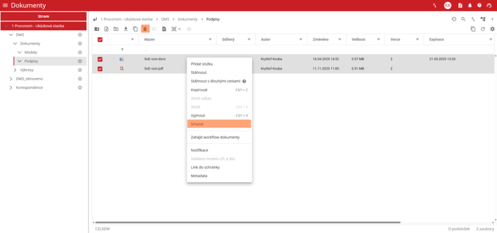Další možností je použití tlačítka „Smazat vybrané“ s ikonou popelnice v horní liště nad tabulkou dokumentů. Poslední možnost je stisknutí klávesy Delete.