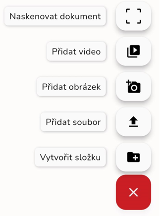 Uživatel může nahrát soubor kliknutím na červené tlačítko s ikonou čar v pravém dolním rohu obrazovky. V nově zobrazené nabídce uživatel zvolí „Naskenovat dokument“.