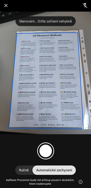 Po výběru možnosti a povolení přístupu aplikace k fotoaparátu se uživateli zobrazí fotoaparát s modře vyznačenou oblastí. Tato oblast se přizpůsobí papíru, který chce uživatel naskenovat. V moment ideálního nastavení a osvětlení stačí, aby uživatel dokument vyfotil a poté potvrdil naskenovanou oblast. Dokument se uloží pod názvem „sken“. Doporučujeme soubor přejmenovat.