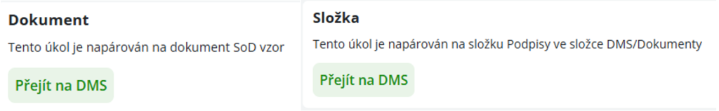 Po kliknutí se otevře okno „Úkoly“ daného dokumentu/složky. Po vytvoření a uložení úkolu se k úkolu přidá odkaz na daný dokument/složku, po kliknutí na tlačítko Otevřít DMS se nám nalistuje.