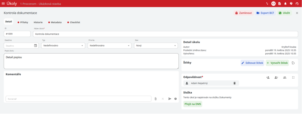 Tvorbu a vyplnění detailu úkolu je popsáno v kapitole 5.3. Detail úkolu