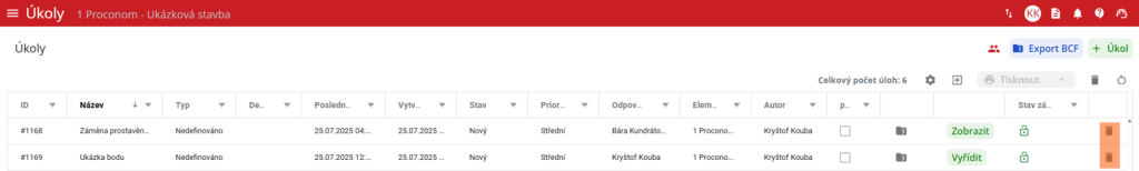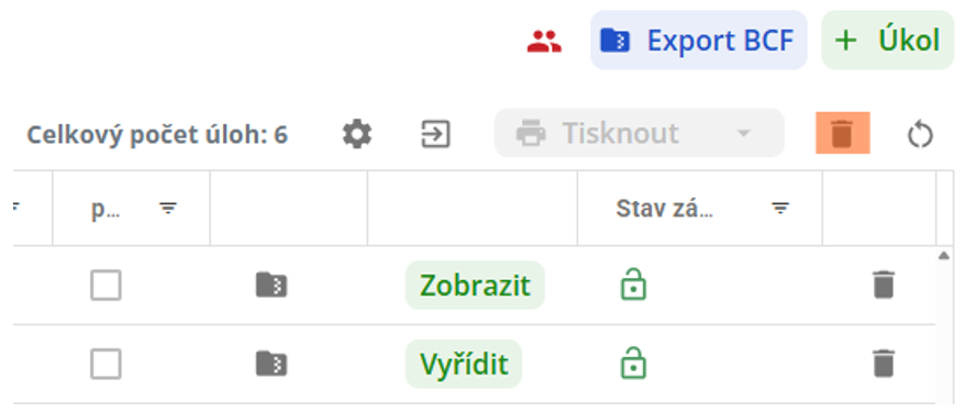 V pravé horní části obrazovky seznamu úkolů se nachází ikona složky „Export BCF“ . Uživatel na tuto ikonu může kliknout v případě, kdy má označený jeden či více řádků v tabulce s úkoly. Po kliknutí na ikonu uživatel zvolí místo uložení v zařízení uživatele.