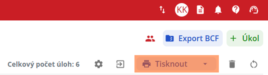 Tisk úkolu provede uživatel označením požadovaného úkolu levým tlačítkem myši a kliknutím na ikonu „Tisknout“ v pravé horní části obrazovky.