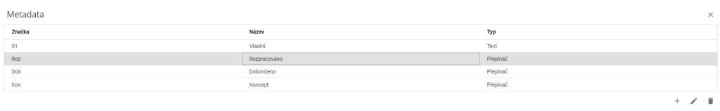V pravém dolním rohu se nachází ikona plus . Stisknutím této ikony se zobrazí dialogové okno nového metadata.