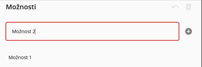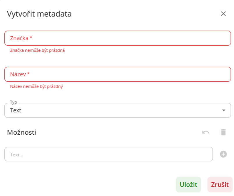 Po výběru typu uživatel musí vyplnit hodnoty v daném metadatu. Provede tak v sekci “Možnosti“. Uživatel zapíše do pole hodnotu (vepsáním nebo využitím ikony v pravé části pole). Hodnotu uloží kliknutím na ikonu plus vpravo od pole.
