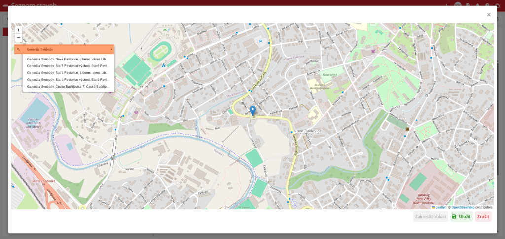 zobrazí uživatel pole, kam vepíše adresu. Kliknutím na vyhledanou adresu potvrdí uživatel polohy.