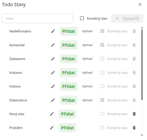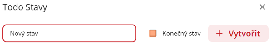 . V nově zobrazeném dialogovém okně uživatel začne psát název typu do pole “Nový stav“. Po zapsání názvu uživatel checkboxem zvolí, zda se jedná o konečný stav. Poté potvrdí přidání stavu do seznamu pod polem tlačítkem “Vytvořit“ v pravé části pole. Stav se nyní objeví v seznamu typů pod polem.
