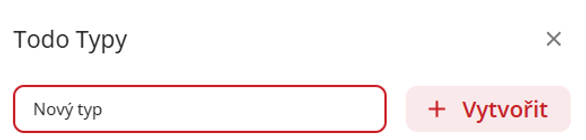 . V nově zobrazeném dialogovém okně uživatel začne psát název typu do pole “Nový typ“. Po zapsání názvu uživatel potvrdí přidání typu do seznamu pod polem tlačítkem “Vytvořit“ v pravé části pole. Typ se nyní objeví v seznamu typů pod polem.