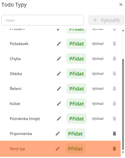Typ se nyní smazal ze seznamu pod tlačítkem “Přidat typ“.