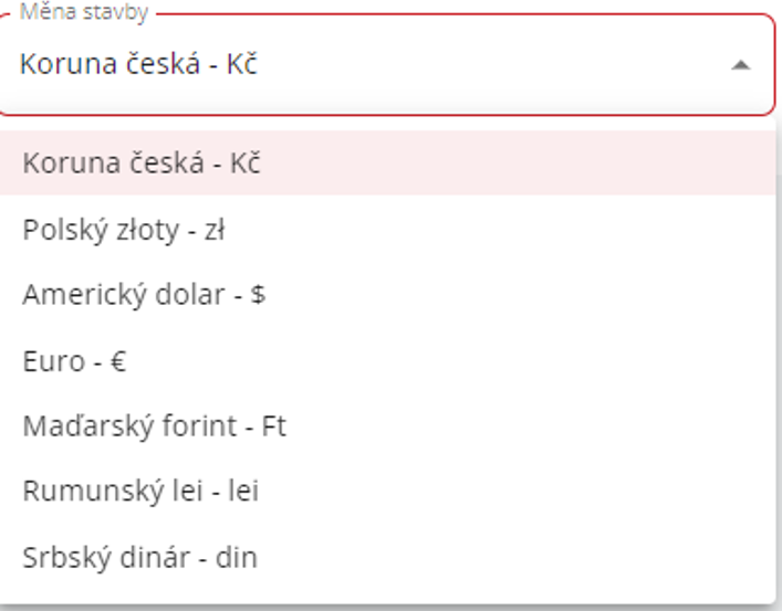 Tímto polem uživatel nastaví měnovou složku dané stavby.