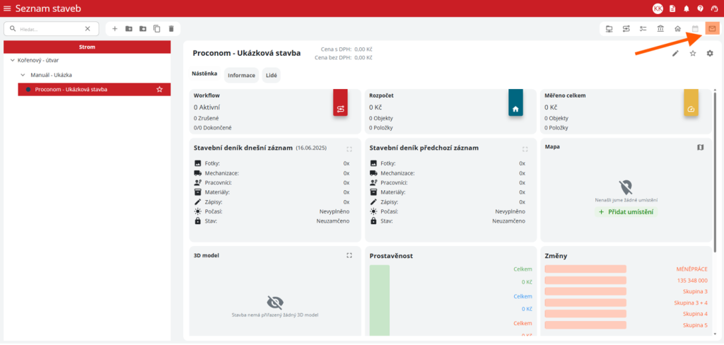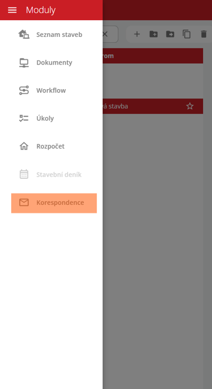 V detailu stavby v levém horním rohu uživatel najde ikonu menu. Po otevření se z levé části obrazovky vysune menu modulů, kliknutím na tlačítko “Korespondence“ uživatel modul spustí.