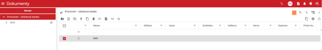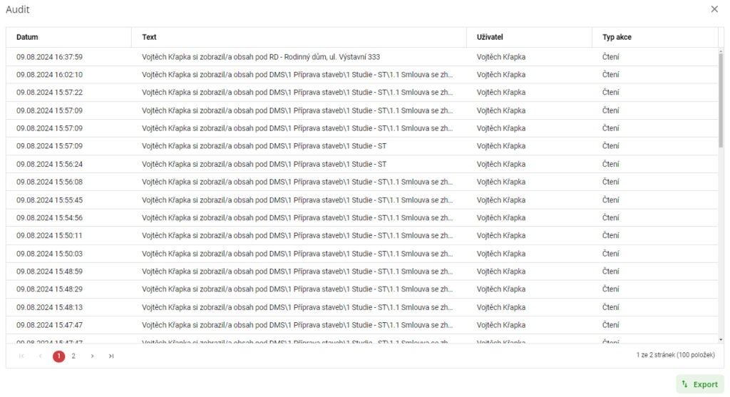 V horní části obrazovky vlevo od vyhledávacího pole uživatel najde ikonu šipky s hodinami . Po rozkliknutí ikony se otevře nové okno s tabulkou akcí prováděných v DMS. Tabulku lze filtrovat přetažením sloupce nad zbytek sloupců. Pro export obsahu auditu do souboru .xlsx je zapotřebí kliknout na tlačítko „Export“ vpravo dole.